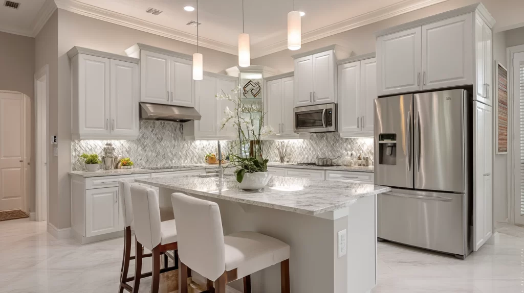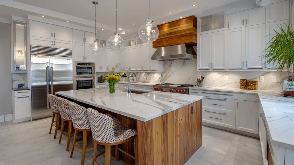 Marble tile remains a beloved luxury in kitchen tile designs when used wisely. Marble floor tile or marble tile for walls can create stunning focal point, especially around kitchen islands or with tile backsplash that echoes the stone veins. But because real marble is porous and needs sealing and careful maintenance it is often better reserved for accent or wall tile, or used as marble look tile in porcelain or ceramic that mimics the visual weight and natural stone texture without more maintenance. Many homeowners love the high‑end look of marble tiles but choose porcelain tile with marble design to avoid more maintenance and prevent staining.